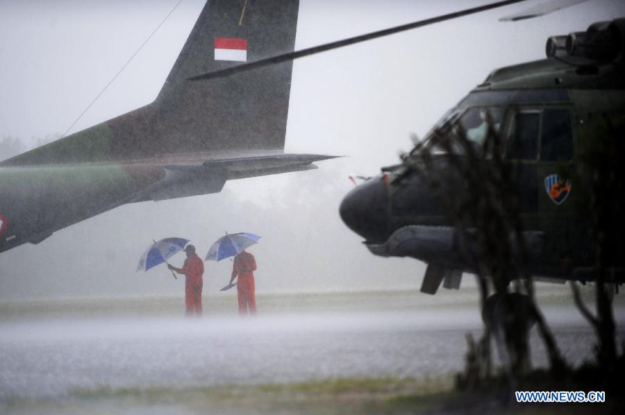 Indonesian air force pilots hold umbrellas to get shelter from heavy rain while their plane is canceled to fly at Pangkalan Bun, Indonesia, Jan. 4, 2015. The search and rescue team has yet to find the black boxes of crashed AirAsia flight QZ8501 as bad weather still lingers in the crash site, an Indonesian official said here Saturday. (Xinhua/Agung Kuncahya B.)