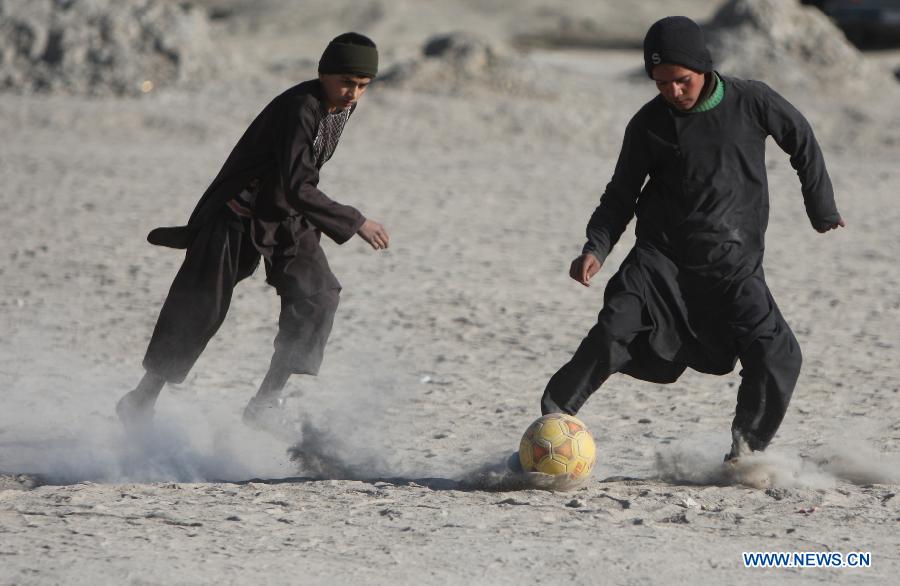 Afghan children play soccer on the dusty ground outside their homes at a slum area in Kabul, Afghanistan on Jan. 3, 2015. (Xinhua/Ahmad Massoud)