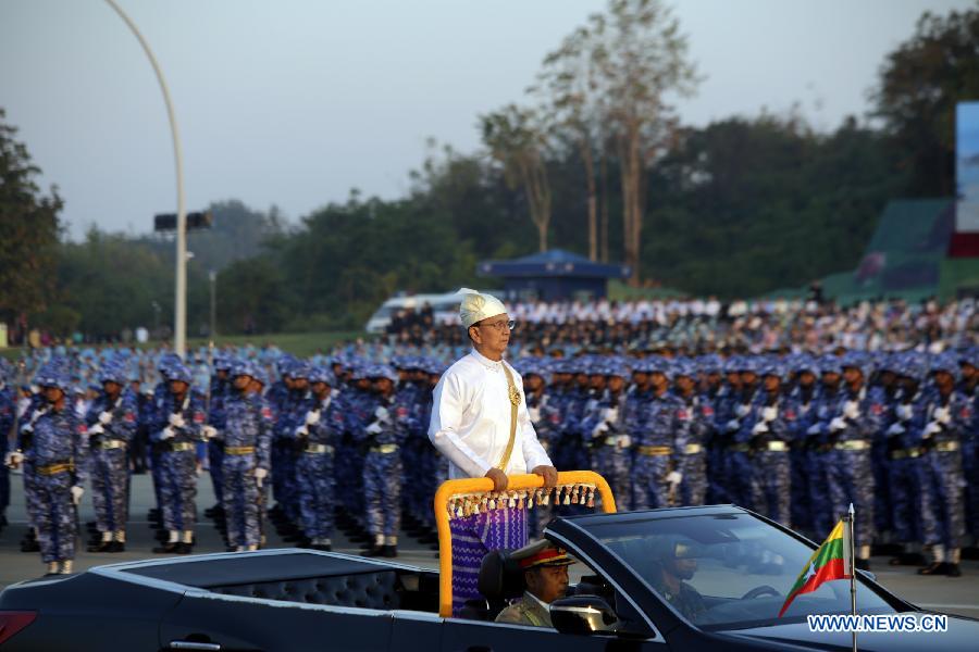 Myanmar President U Thein Sein (C) stands on vehicle as he inspects soldiers during a ceremony to mark the 67th anniversary of Myanmar's Independence day in Nay Pyi Taw, Myanmar, Jan. 4, 2015. Myanmar resumed military parade and mass procession Sunday to celebrate the country's Independence Day for the first time in over five decades since the end of 1950s. (Xinhua/U Aung)