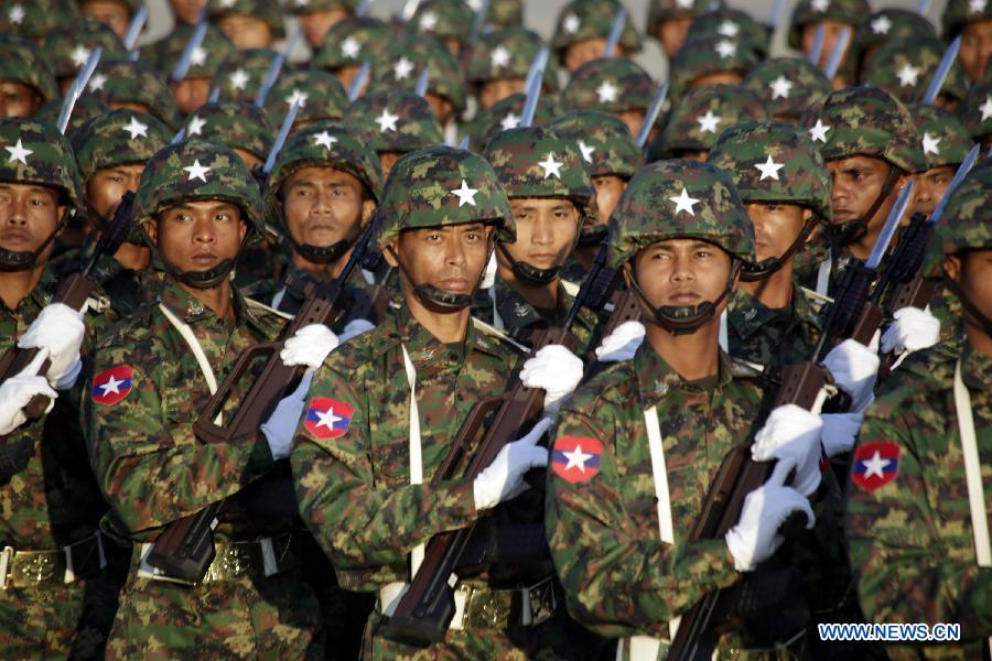 Myanmar soldiers participate in a ceremony to mark the 67th anniversary of Myanmar's Independence day in Nay Pyi Taw, Myanmar, Jan. 4, 2015. Myanmar resumed military parade and mass procession Sunday to celebrate the country's Independence Day for the first time in over five decades since the end of 1950s. (Xinhua/U Aung)