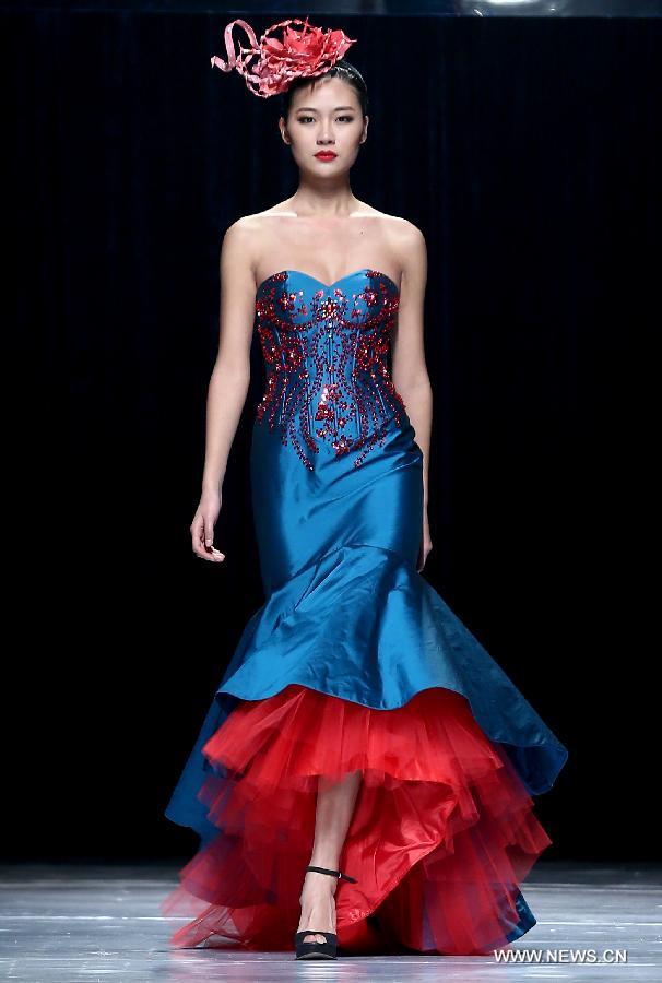 | A model presents a creation by Malaysian designer Carven Ong at a wedding dress show during the China-ASEAN fashion week in Nanning, capital of southwest China's Guangxi Zhuang Autonomous Region, Jan. 3, 2015. (Xinhua/Chen Jianli) |