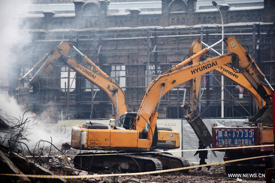 Heavy machinery clear the debris of a burnt warehouse at the Beifangnanxun ceramics market in Daowai District, Harbin, capital of northeast China's Heilongjiang Province, Jan. 4, 2014. The warehouse blaze in Harbin City that killed 5 firefighters still hasn't been completely extinguished, local firefighters said on Sunday. As of 10:40 a.m. Sunday, a residential building next to the warehouse was still smoldering. Rescuers said that the source of the fire has been hard to determine due to the building's complicated structure, and the building is at risk of collapsing. Firefighters are working from outside to extinguish the flames. (Xinhua/Wang Jianwei)