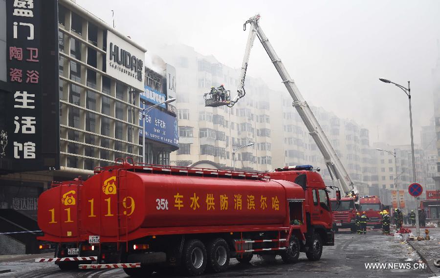 Smokes rise from a burnt warehouse at the Beifangnanxun ceramics market in Daowai District, Harbin, capital of northeast China's Heilongjiang Province, Jan. 4, 2014. The warehouse blaze in Harbin City that killed 5 firefighters still hasn't been completely extinguished, local firefighters said on Sunday. As of 10:40 a.m. Sunday, a residential building next to the warehouse was still smoldering. Rescuers said that the source of the fire has been hard to determine due to the building's complicated structure, and the building is at risk of collapsing. Firefighters are working from outside to extinguish the flames. (Xinhua/Wang Jianwei)
