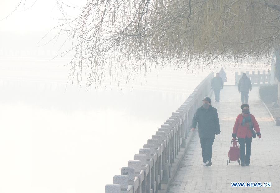 People walk in smog in Lianyungang City, east China's Jiangsu Province, Jan. 4, 2015. China's top meteorological authority forecast medium to severe smog in the country's northern regions including Beijing and Tianjin as well as the neighboring Hebei Province on Sunday. Meanwhile, smoggy weather will also affect the country's eastern province of Jiangsu as well as the southwestern province of Sichuan on Sunday. (Xinhua/Geng Yuhe)