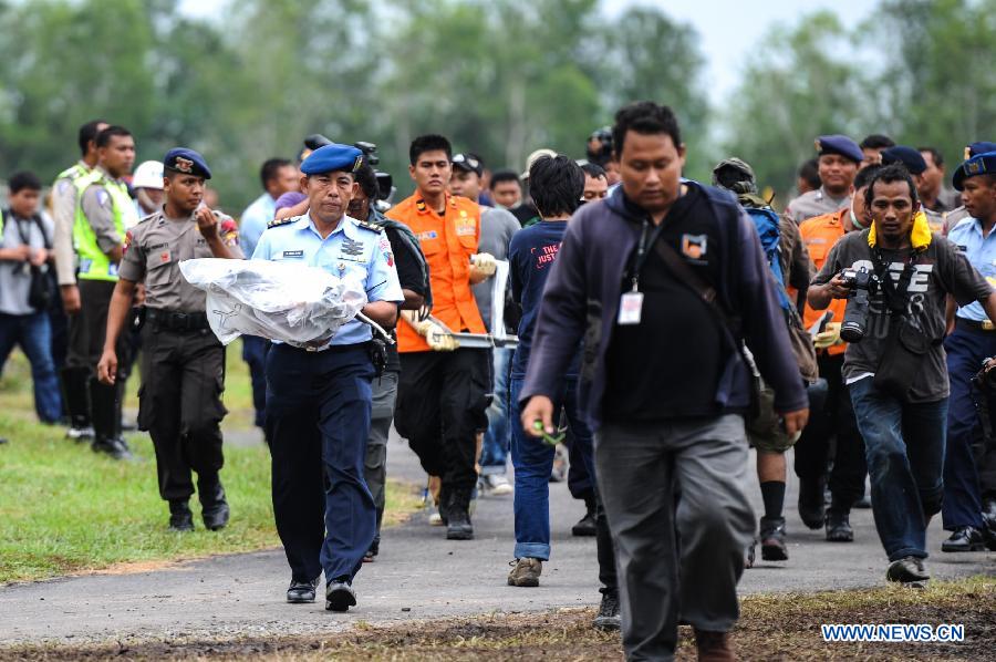 TNII crew members carry debris of AirAsia flight QZ8501 from USS Navy helicopter at Iskandar Air Base, Pangkalan Bun, Central Kalimantan, Indonesia, Jan. 5, 2015. (Xinhua/Veri Sanovri)