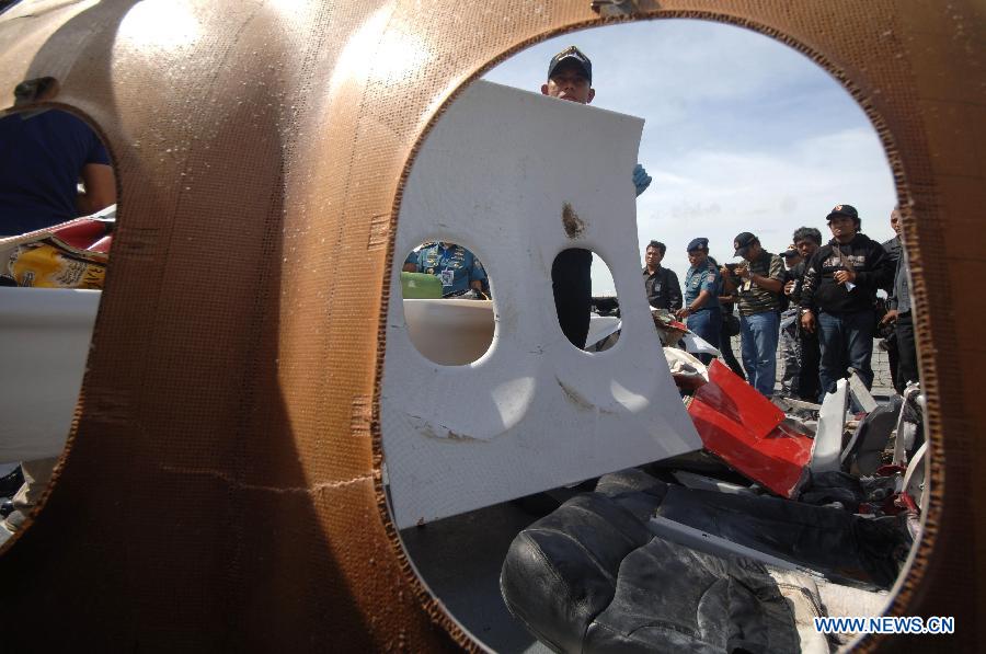 Indonesian Navy crew members of ship KRI Bung Tomo show the media the debris of AirAsia flight QZ8501 recovered in search operations at a naval base in Surabaya, Indonesia, Jan. 5, 2015. (Xinhua/ Syaiful Arif)
