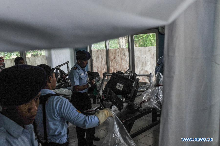 NI crew members check the debris of AirAsia flight QZ8501 in the isolate room at Iskandar Air Base, Pangkalan Bun, Central Kalimantan, Indonesia, Jan. 5, 2015. (Xinhua/Veri Sanovri)
