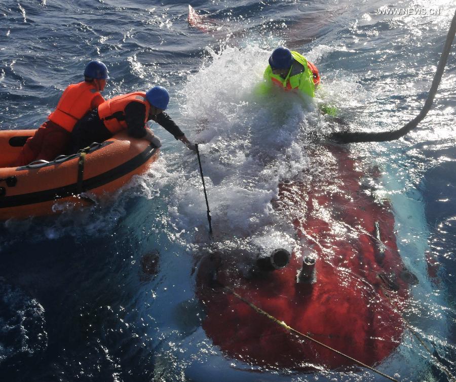 Working staff try to tie the rope on China's manned submersible Jiaolong in the seabed of southwestern Indian Ocean, Jan. 4, 2015. Jiaolong, named after a mythical dragon, is on a 120-day expedition in the southwest Indian Ocean. It has planned to conduct 20 dives during the four-month period to research polymetallic sulfide, biological diversity, hydrothermal microbes and genetic resources in the area. (Xinhua/Zhang Xudong)
