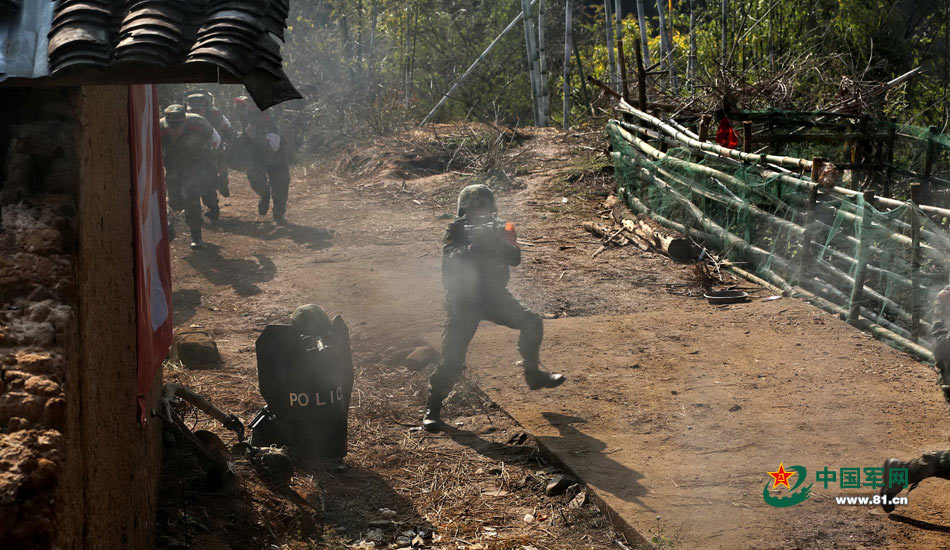 The armed police frontier force conducted an across-regional military exercise in south China’s Guangdong province on Dec. 29, 2014. Over 1,000 soldiers traveled 300 kilometers to encircle and suppress a drug-producing village and rescue hostages. All the training subjects were completed successfully. (www.81.cn/Liao Jian)