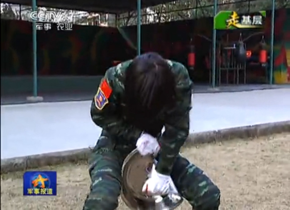 Photo shows a female SWAT member in Sichuan ripping apart a steel wash basin barehanded. Four hours physical training every day turns an ordinary woman into an invincible soldier. (Photo/CCTV)