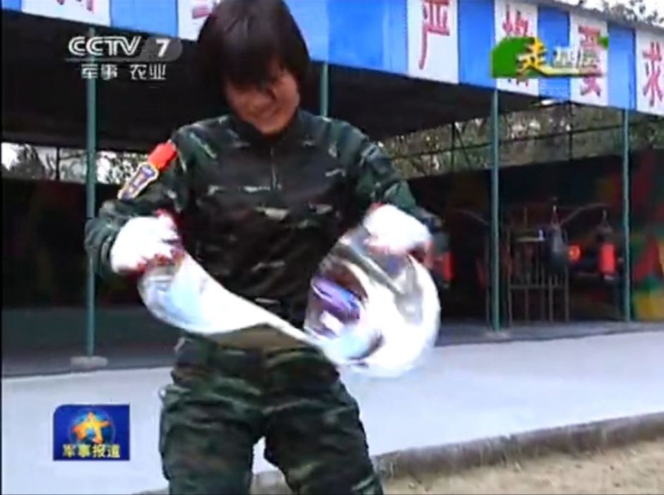 Photo shows a female SWAT member in Sichuan ripping apart a steel wash basin barehanded. Four hours physical training every day turns an ordinary woman into an invincible soldier. (Photo/CCTV)