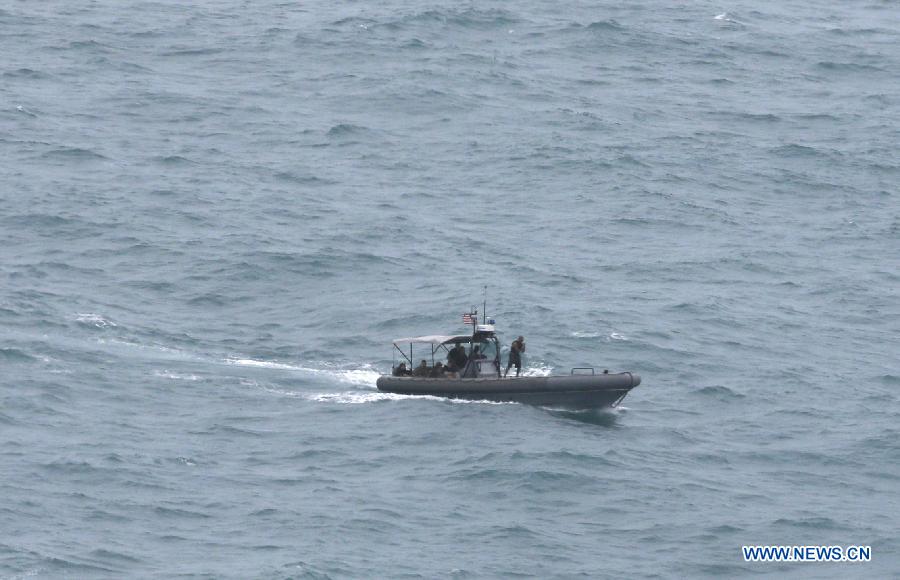A Malaysian Navy rubber boat is seen from Indonesian Air Force NAS 332 Super Puma helicopter during a search operation for the victims of AirAsia QZ8501 off Pangkalan Bun, Indonesia, Jan. 6, 2015. The search operation for AirAsia Flight QZ8501 will spread slightly eastward on Tuesday as the weather and currents drag wreckage in that direction, the head of Indonesia's rescue agency said. (Xinhua/Pool/Achmad Ibrahim)