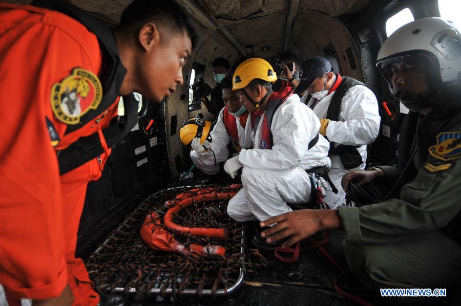 Search and Rescue crew members prepare their equipment in a helicopter during the evacuation of victims of AirAsia flight QZ8501 at Iskandar Air Base, Pangkalan Bun, Central Kalimantan, Indonesia, Jan. 6, 2015. The search operation for AirAsia Flight QZ8501 will spread slightly eastward on Tuesday as the weather and currents drag wreckage in that direction, the head of Indonesia's rescue agency said. (Xinhua/Veri Sanovri)