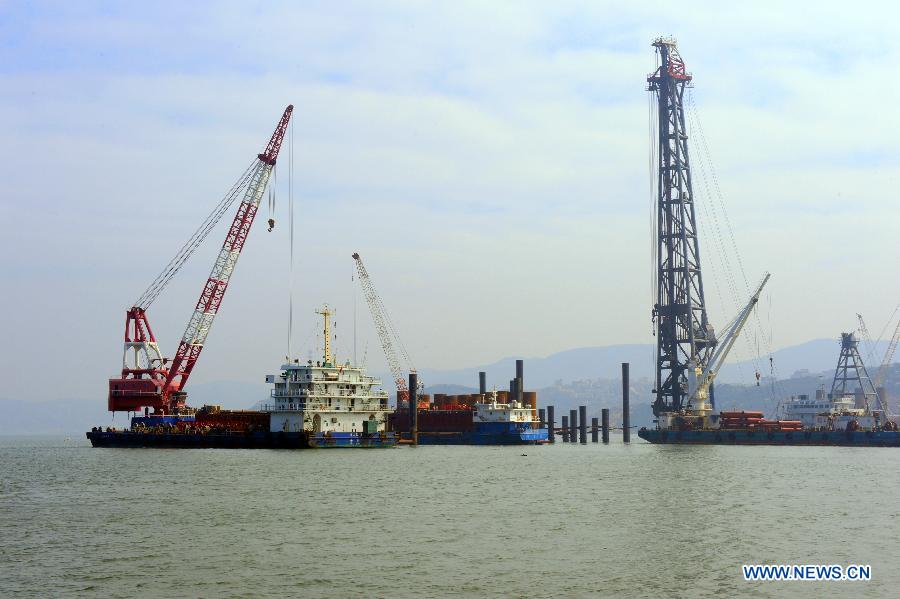 | Photo taken on Jan. 6, 2015 shows the Pingtan cross-strait highway-railway bridge under construction in southeast China's Fujian Province. The bridge, which is the first one of this kind in China, is expected to open to traffic in 2019. (Xinhua/Zhang Guojun) |