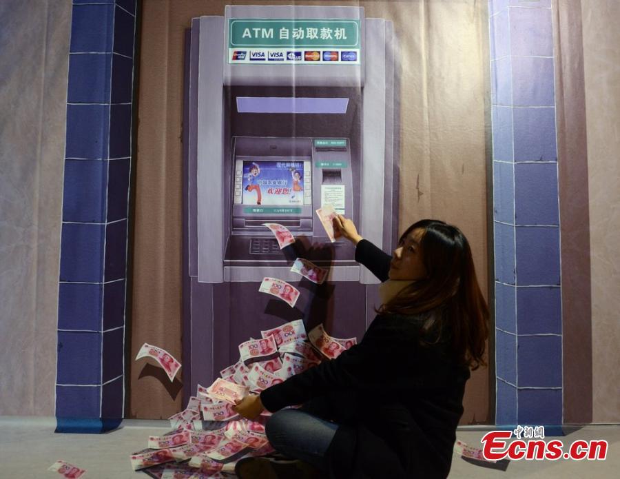 Visitors pose for a photo inside a room that uses 3D paintings to create optical illusions in Suzhou, east China's Jiangsu province on Jan. 7, 2015. The 3D painting exhibition also combines light show, art installations and sculptures. (CNS/Wang Sizhe)