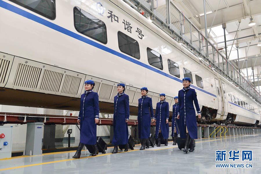 Female train attendants who will work on Inner Mongolia’s first bullet train pose for photos in navy blue uniforms with Mongolian style design on Jan. 6, 2015. The first CRH (China Railway High-speed) train in Inner Mongolia will be put into operation on Jan. 8, 2014. (Xinhua/ Wang Zheng)