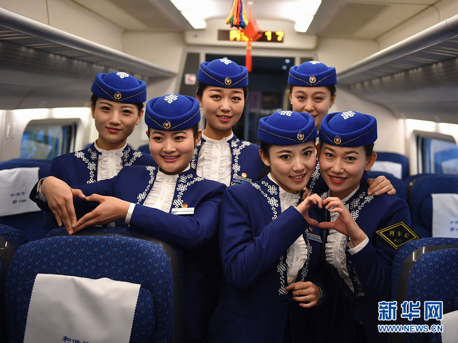 | Female train attendants who will work on Inner Mongolia’s first bullet train pose for photos in navy blue uniforms with Mongolian style design on Jan. 6, 2015. The first CRH (China Railway High-speed) train in Inner Mongolia will be put into operation on Jan. 8, 2014. (Xinhua/ Wang Zheng) |