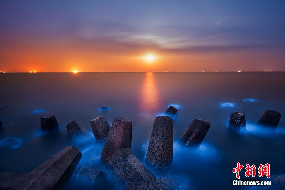 The sea has a blue fluorescent color at night in Dongying, east China’s Shangdong province, making the seaside an “Avatar World”. Such phenomenon is usually caused by fluorescent microorganism such as flagellate in the sea water. Researchers from Ocean University of China say that they need to analyze the sea water sample in the lab to determine the cause. (Chinanews/Li Xingzhuo)