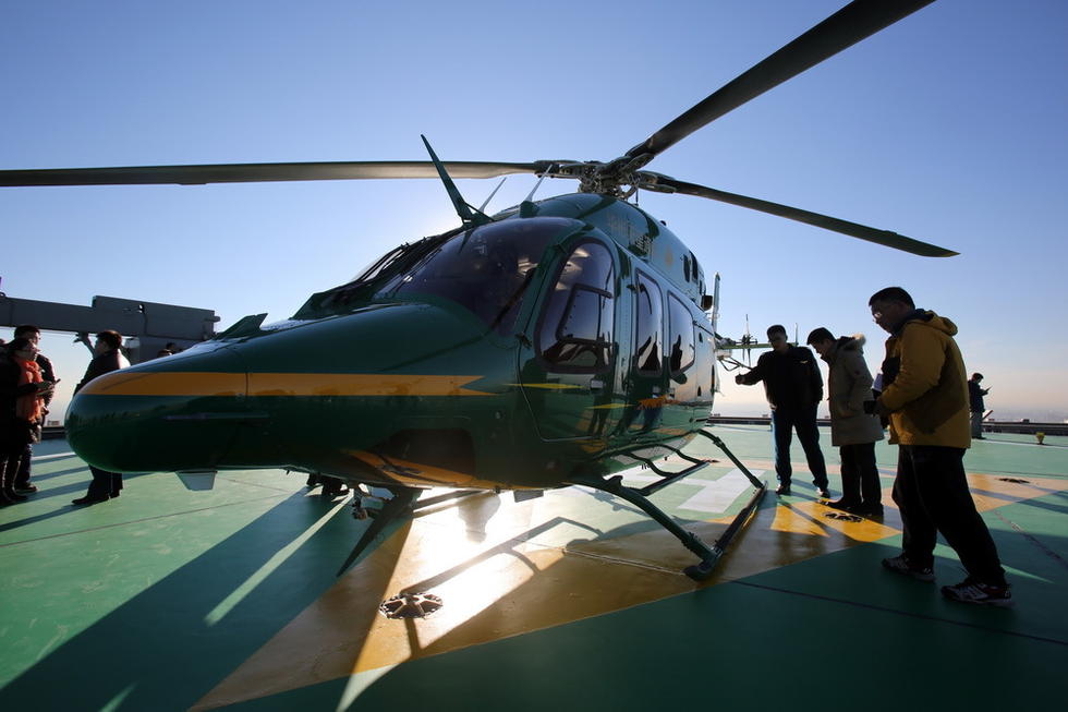 A Bell 429 helicopter lands on the parking apron of the 330-meter-high China World Trade Center Tower 3 on Jan. 6, 2015, which signifies that the highest parking apron in Beijing officially came into use. On that day, two other helicopters also landed on this parking apron. (Beijing News/Li Dong)