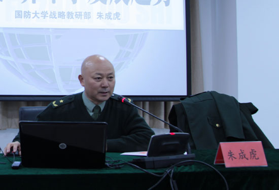 | Zhu Chenghu, professor and major general at National Defense University PLA China, delivers a speech at a forum on international issues in Beijing Tuesday. (People's Daily Online/Qiu Yue) |