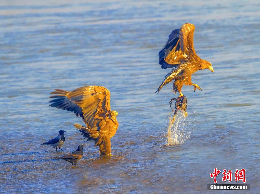 Photo shows the white-tailed eagles fishing in Yili, northwest China's Xinjiang autonomous region in winter. Some ducks and stray dogs nearby also came to share the food of the eagles. Thanks to the recovery of the ecologic environment of Ili River Basin, more and more white-tailed eagles come to spend winter there. (CNS/Yang Yongguang)