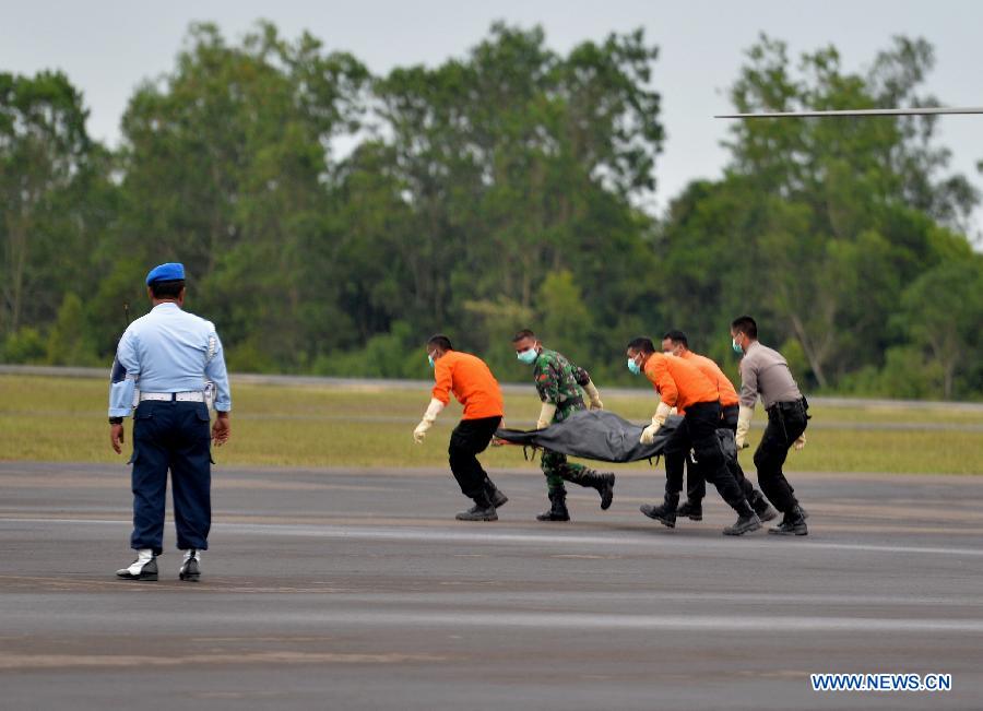 Rescuers carry the body of a victim of AirAsia flight QZ8501 to a transport plane in Pangkalan Bun, Indonesia, on Jan. 8, 2015. So far, 44 bodies have been discovered by a multinational search team. (Xinhua/He Changshan)