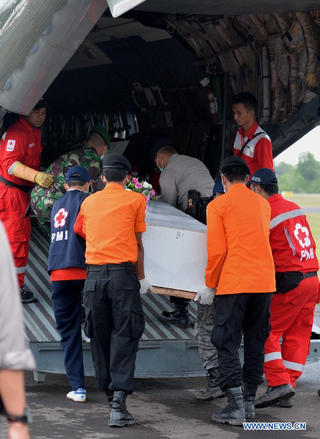 Rescuers carry a coffin containing the body of a victim of AirAsia flight QZ8501 to a transport plane in Pangkalan Bun, Indonesia, on Jan. 8, 2015. So far, 44 bodies have been discovered by a multinational search team. (Xinhua/He Changshan)