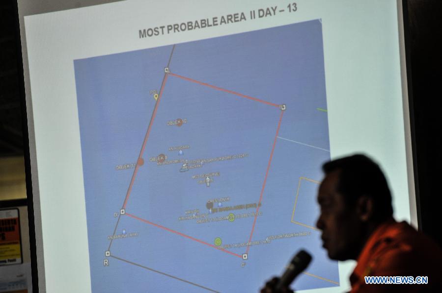 Bambang Soelistyo, head of Indonesia's National Search and Rescue Agency, shows the possible area of the blackbox during the 13th searching and evacuation of the AirAsia Flight QZ8501, in Jakarta, Indonesia, Jan. 9, 2015. (Xinhua/Veri Sanovri)