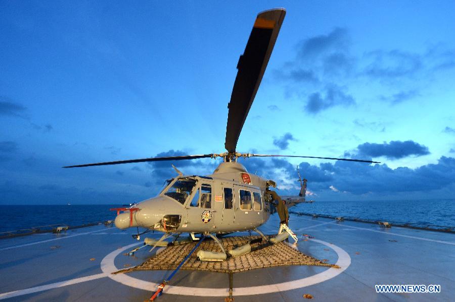 Indonesian Navy engineers check a helicopter as they prepare to lift the tail of AirAsia flight QZ8501 from the Java sea January 9, 2015. Indonesia said on Jan. 7, 2015 it had found the tail of AirAsia Flight QZ8501, potentially marking a major step towards locating the plane's black boxes and helping shed light on what caused it to crash into the sea 10 days ago. (Xinhua/Adek Berry/Pool)