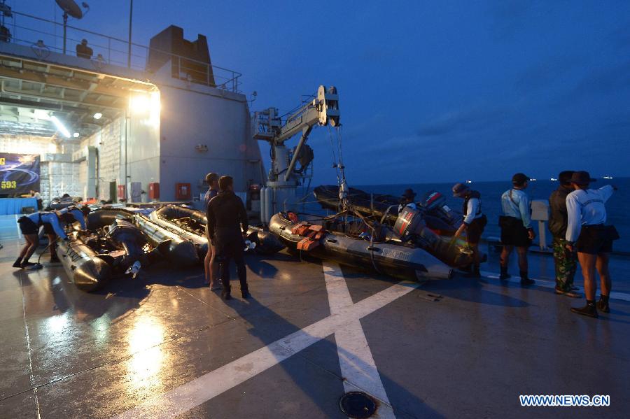 Indonesian Navy divers prepare to lift the tail of AirAsia Flight 8501 in Java sea, Indonesia, Jan. 9, 2015. Indonesia said on Jan. 7, 2015 it had found the tail of AirAsia Flight QZ8501, potentially marking a major step towards locating the plane's black boxes and helping shed light on what caused it to crash into the sea 10 days ago. (Xinhua/Adek Berry/Pool)