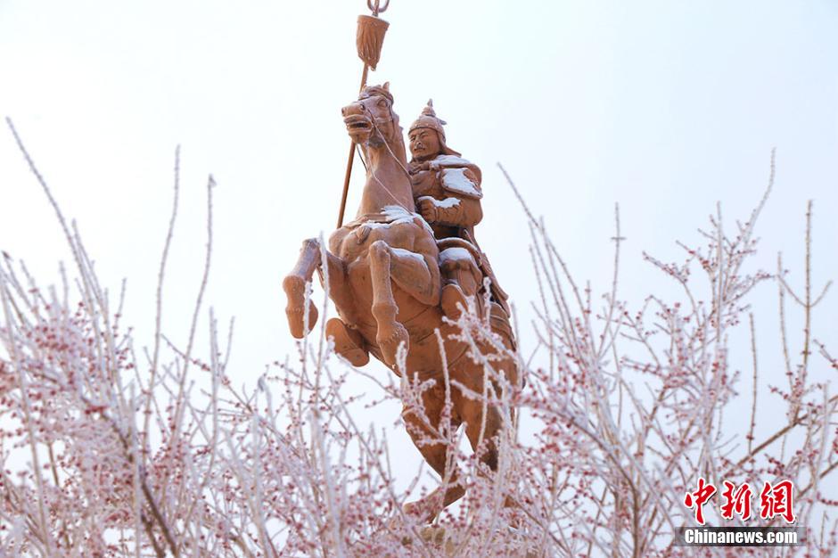 After several days of cold wave, intoxicating scenes of rime appear in Bohu county, Xinjiang, Jan. 9, 2015. People feel like in a fairyland at the Baixin Park of Bohu. (Chinanews/Nian Lei)