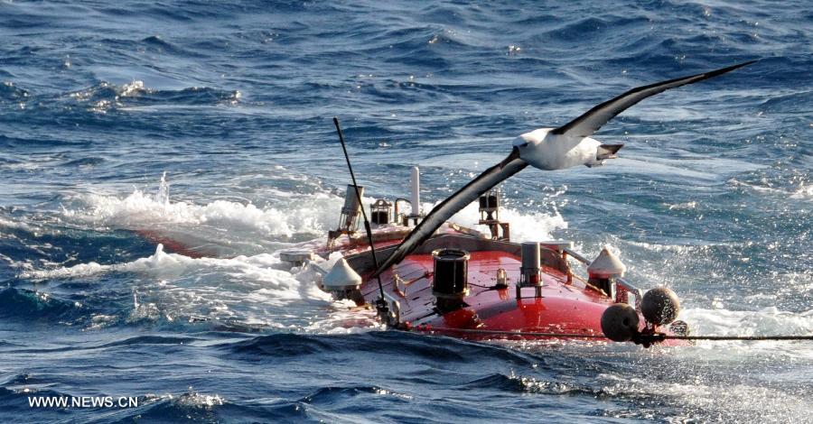 China's deep-sea manned submersible Jiaolong comes out of water as a sea bird takes flight around it in the southwest Indian Ocean, Jan. 10, 2015. Jiaolong carried out an exploration mission to study active hydrothermal vent in the southwestern Indian Ocean. (Xinhua/Zhang Xudong)