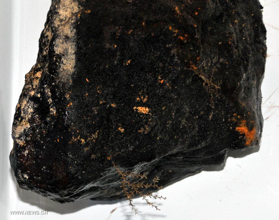 Photo taken on Jan. 10, 2015 shows a coral on a basalt collected by Jiaolong, China's deep-sea manned submersible, in the southwest Indian Ocean. Jiaolong carried out an exploration mission to study active hydrothermal vent in the southwestern Indian Ocean. (Xinhua/Zhang Xudong)