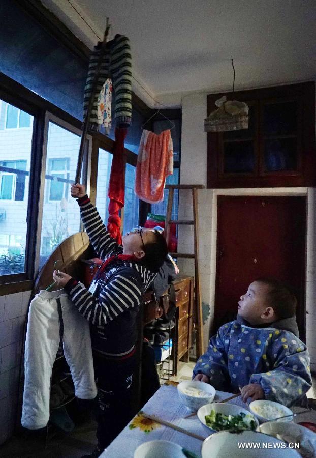 Mo Shuangyi (L) hangs newly washed laundry at home as his younger brother look on in Tonggu County of Yichun, east China's Jiangxi Province, Jan. 9, 2015. After his father was diagnosed with leukemia in October 2014, Shuangyi, a 10-year-old schoolboy in Tonggu County, decided to collect recyclable wastes and sell them for money in order to save his father, who thought of giving up treatment because of high medical costs. His filial deeds caught extensive attention when pictures of him collecting wastes spread on the Internet. Shuangyi's family received public donations and a series of subsidies from local authorities soon after. The boy has now returned to school to focus on his education. (Xinhua/Chen Zixia)