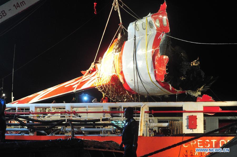 The tail part of crashed AirAsia flight QZ8501 is transferred from Crest Onyx ship in the port of Kumai, Pangkalan Bun, Indonesia, Jan. 11, 2015. (Xinhua/Zulkarnain)