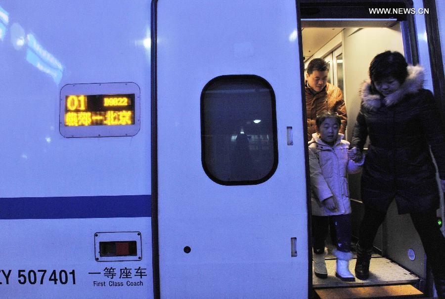 Passengers living in Yanjiao Township, Sanhe City of north China's Hebei Province, arrive at Beijing Railway Station by a high-speed train in Beijing, capital of China, Jan. 12, 2015. It took passengers only half an hour by the high-speed railway from their living place in Beijing's neighboring area to their working place in Beijing. The train, which was put into service on Monday, only ran at rush hour in every morning and evening, offering convenience to workers. (Xinhua/Li Wen)