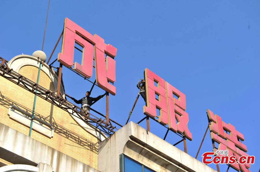 Workers remove signs atop a wholesale mall at Beijing Zoo Market in the city’s Xicheng district on January 11, 2015. The mall named “Tianhaocheng” was the first one in the wholesale market area that had its signs removed. Most wholesalers have already moved out of the mall. With a business area of more than 300,000 square meters and 13,000 stalls, the Beijing Zoo Market represents the largest clothing wholesale distribution center in North China. The relocation project over the market is designed to improve downtown functions and relieve overcrowding and traffic jams. [Photo: chinanews.com/ Jin Shuo]