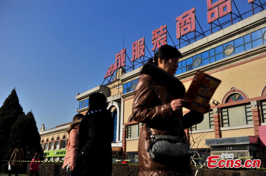 | Workers remove signs atop a wholesale mall at Beijing Zoo Market in the city’s Xicheng district on January 11, 2015. The mall named “Tianhaocheng” was the first one in the wholesale market area that had its signs removed. Most wholesalers have already moved out of the mall. With a business area of more than 300,000 square meters and 13,000 stalls, the Beijing Zoo Market represents the largest clothing wholesale distribution center in North China. The relocation project over the market is designed to improve downtown functions and relieve overcrowding and traffic jams. [Photo: chinanews.com/ Jin Shuo] |