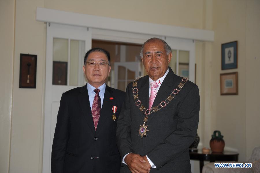 Fijian President Ratu Epeli Nailatikau (R) poses for photos with Chinese Ambassador to Fiji Huang Yong after awarding him the Honorary Officer of the Order of Fiji under the Fiji Honours System in Suva, Fiji, Jan. 12, 2015. Nailatikau thanked Huang Yong for the continuous efforts in strengthening relations between Fiji and China during his three and half-year term in Fiji. (Xinhua/Michael Yang)