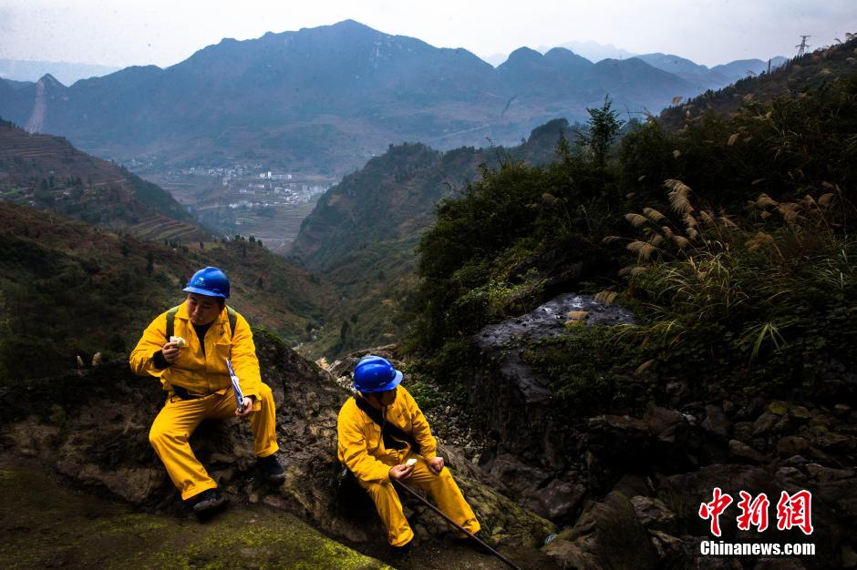 Steep mountains are the severest obstacles for line patrol. The workers have to walk on cliffs and get through jungles to finish work, just like Spiderman. (Chinanews/Deng Gang)