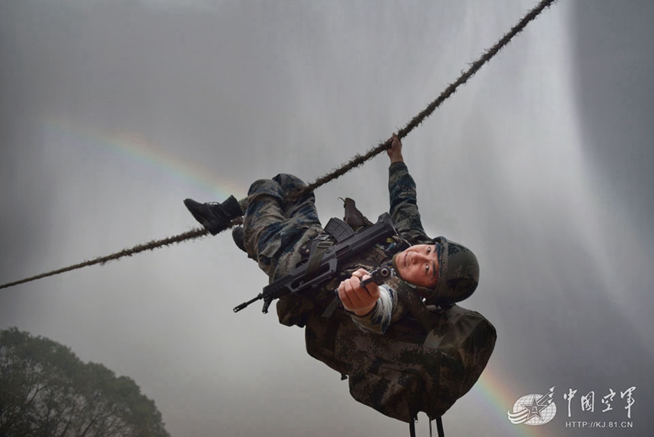 Wang Jianbo crosses a river by rope. (81.cn/Fang Chao, Li Ming)