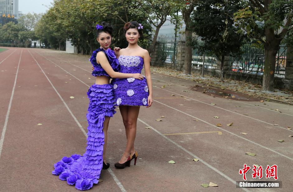 College students in Chengdu Polytechnic show their self-designed wedding dresses made from waster paper on the campus playground, Jan. 12, 2015. (CNS/Zhang Lang)