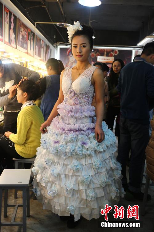 A student in Chengdu Polytechnic wears a self-designed paper wedding dress, Jan. 12, 2015. (CNS/Zhang Lang)