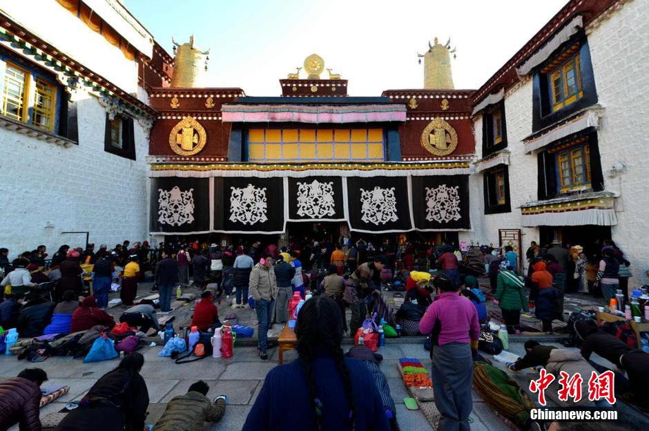 Buddhist believers kowtow in front of the Jokhang Temple on Jan. 13, 2015. (CNS/Li Lin)