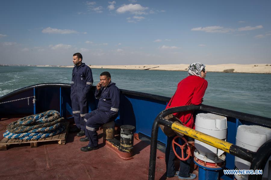 Crew members and an invited guest are seen on a ship to the construction site of the New Suez Canal, in Ismailia, a city by the Suez Canal in Egypt, on Jan. 14, 2015. Egypt launched the new waterway project in August 2014, and the construction was ordered by Egyptian President Abdel-Fattah al-Sisi to be completed in one year. (Xinhua/Pan Chaoyue)