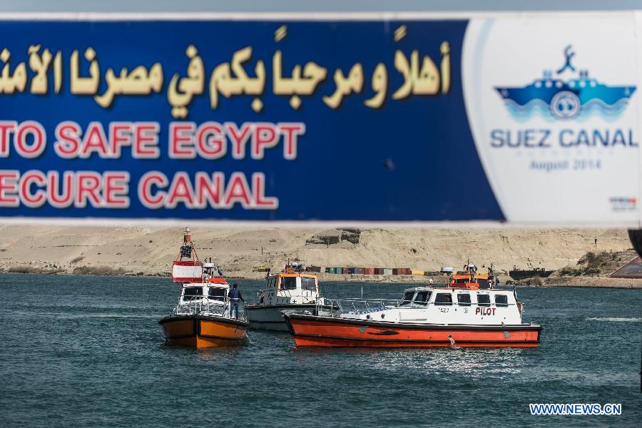 Pilot ships are seen on the Suez Canal in Ismailia, Egypt, on Jan. 14, 2015. Egypt launched the new waterway project in August 2014, and the construction was ordered by Egyptian President Abdel-Fattah al-Sisi to be completed in one year. (Xinhua/Pan Chaoyue)