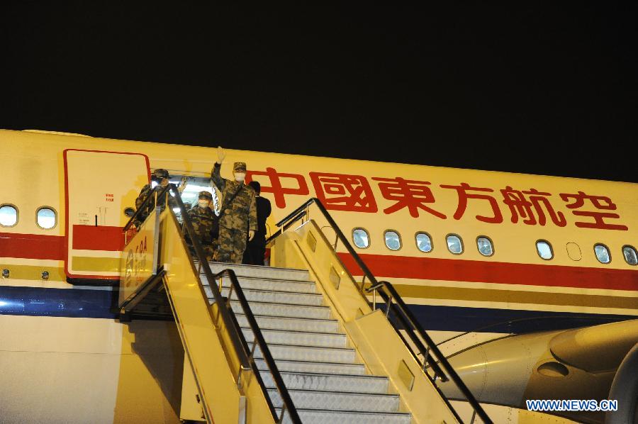 Members of the Chinese medical team assisting in the prevention and control of the Ebola virus in Liberia wave as returning to Chongqing, southwest China, Jan. 16, 2015. A total of 82 medical workers, as the first batch of the 164-member team, returned to motherland on Friday morning. The rest of the group will return on Jan. 22. (Xinhua/Tang Yi)
