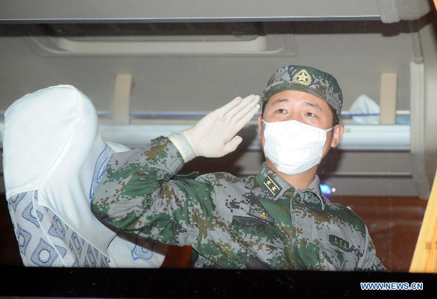 A member of the Chinese medical team assisting in the prevention and control of the Ebola virus in Liberia salutes as returning to Chongqing, southwest China, Jan. 16, 2015. A total of 82 medical workers, as the first batch of the 164-member team, returned to motherland on Friday morning. The rest of the group will return on Jan. 22. (Xinhua/Tang Yi)