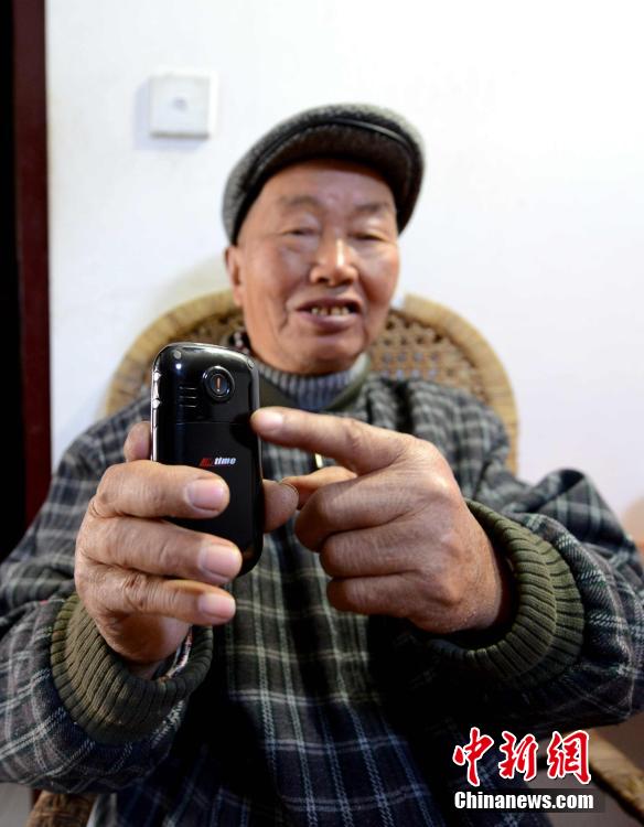 | This is the “one key phone”. Elders only need to press one key to call the service center. (Chinanews/Wang Dongming) |
