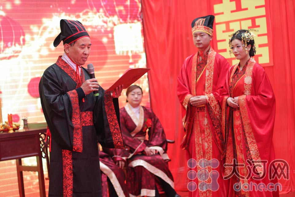 A couple holds a traditional wedding ceremony wearing Hanfu (Han costume) in Heluo Town, Gongyi, central China's Henan Province, Jan. 14, 2015. The wedding ceremony was conducted in accordance with traditional wedding customs of the Zhou Dynasty, and all the wedding attendees wore Hanfu clothes. (dahe.cn/Fan Zhao)
